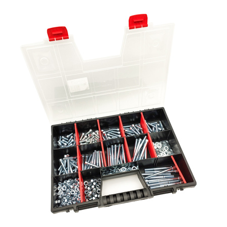 Tato sada obsahuje kompletní sadu šroubů s vnitřním šestihranem M8 v různých délkách a také různé druhy matic a podložek se stejným rozměrem závitu, takže budete mít vždy po ruce vzájemně kompatibilní prvky. A to není vše – spojovací materiál je uložen v praktickém, přenosném a odolném organizéru, který lze díky libovolně nastavitelným přihrádkám využít i pro jiné nářadí a příslušenství.