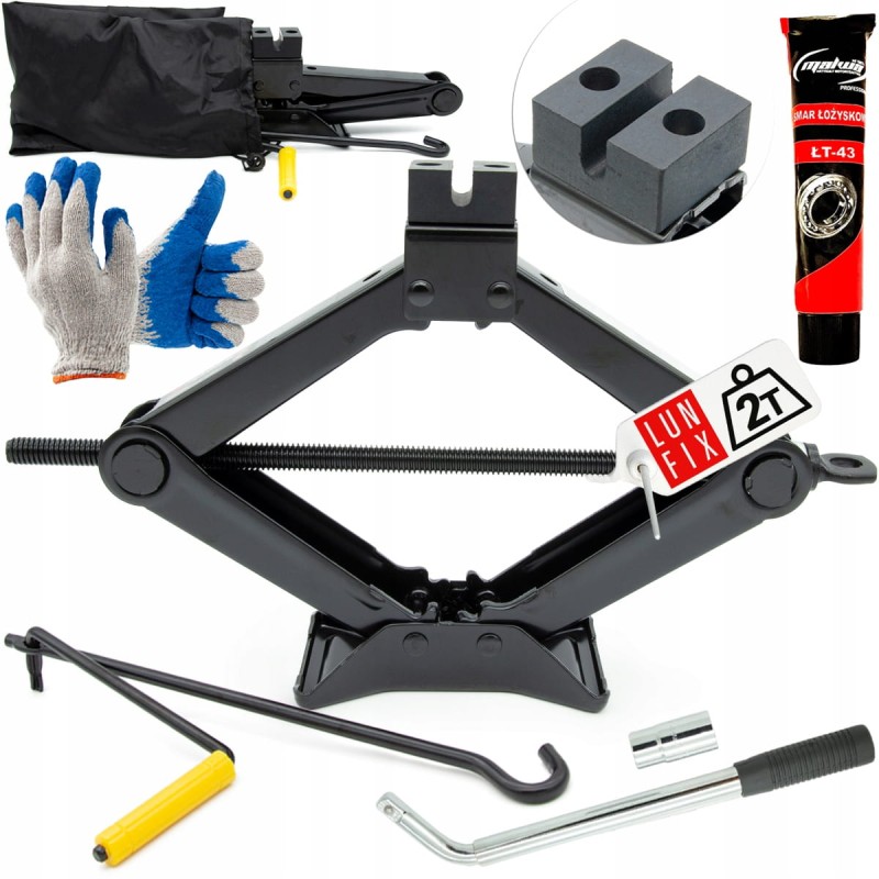 Trapézový zvedák na auto do 2 t v sadě: mazivo, klíč na kola a pracovní rukavice