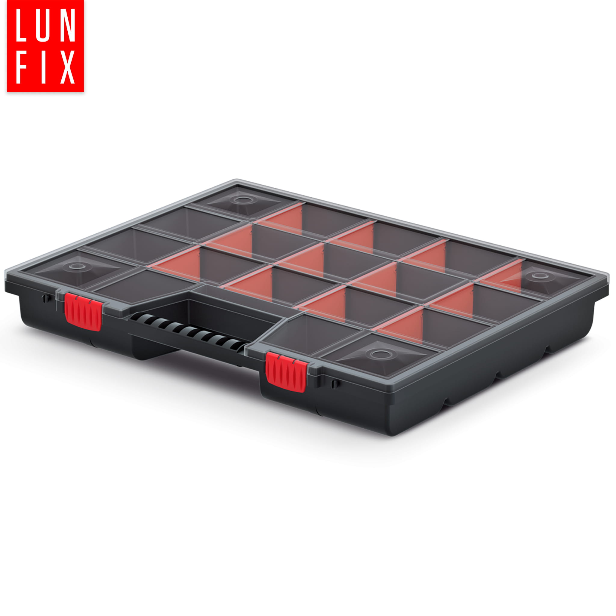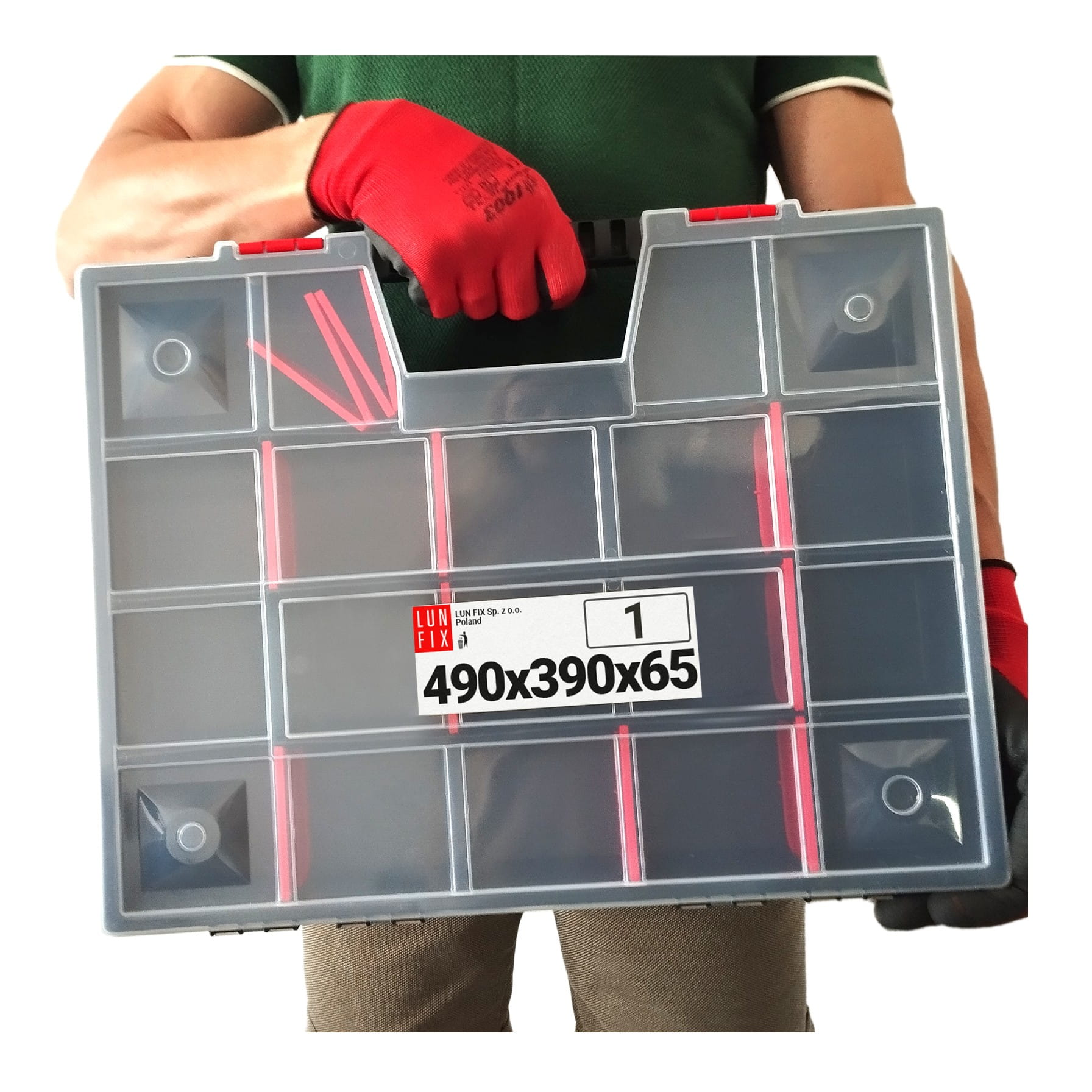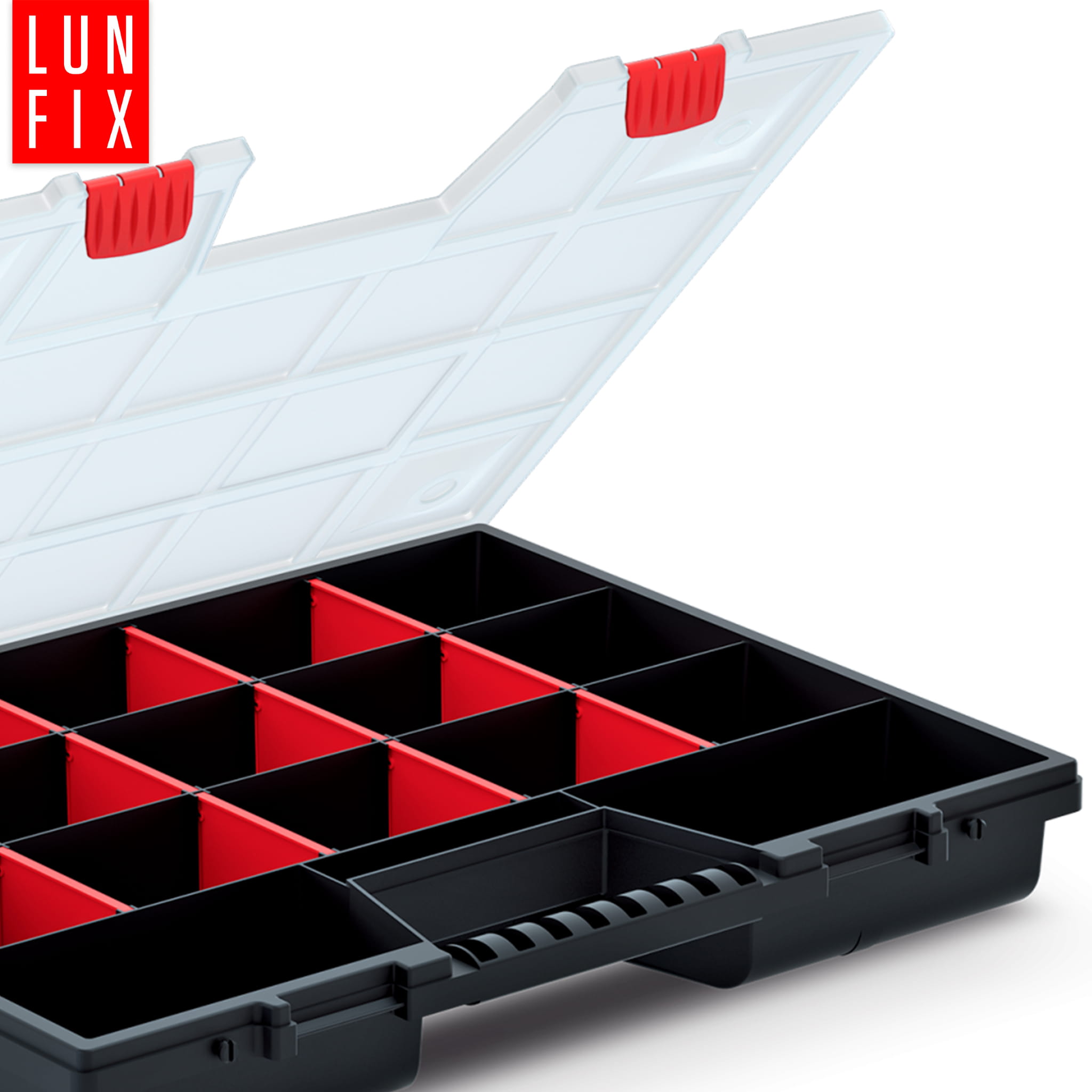 Ergonomická rukojeť umožňuje pohodlné přenášení organizéru a jeho zajišťuje, že těžké prvky v organizéru nezpůsobí zlomení rukojeti