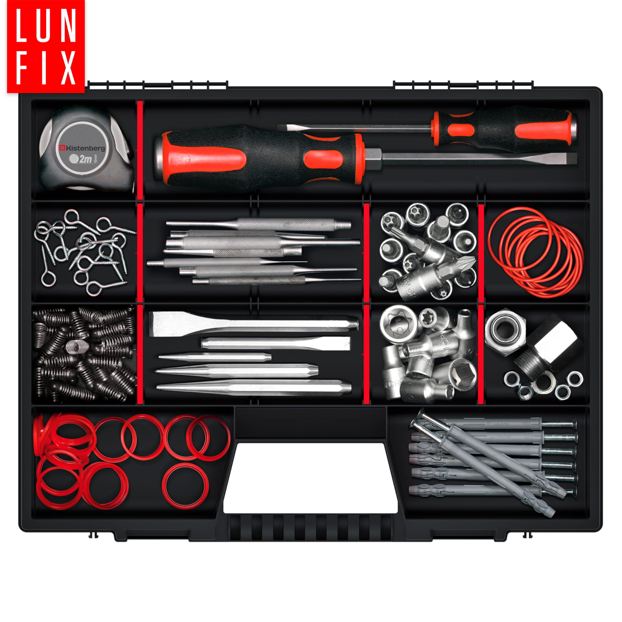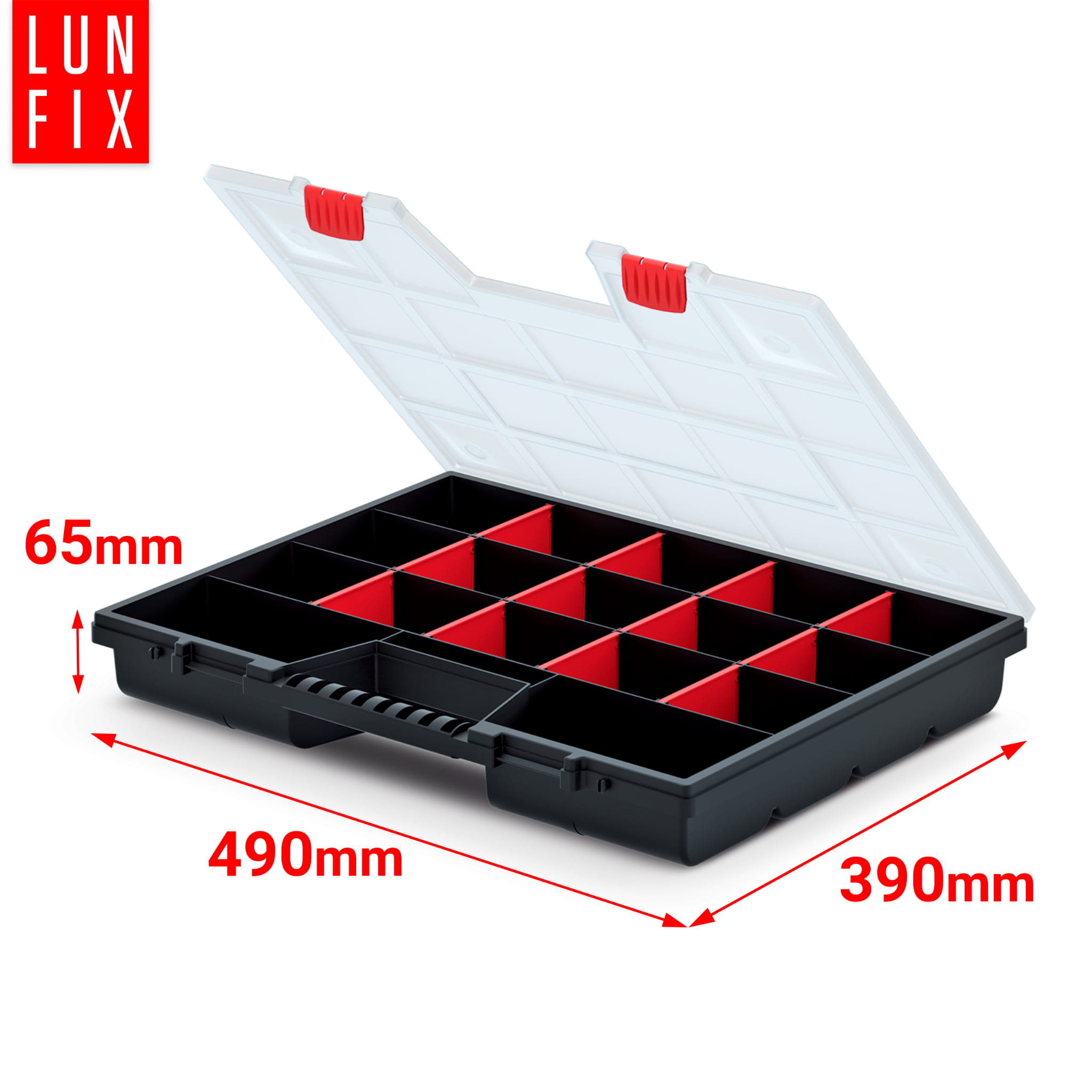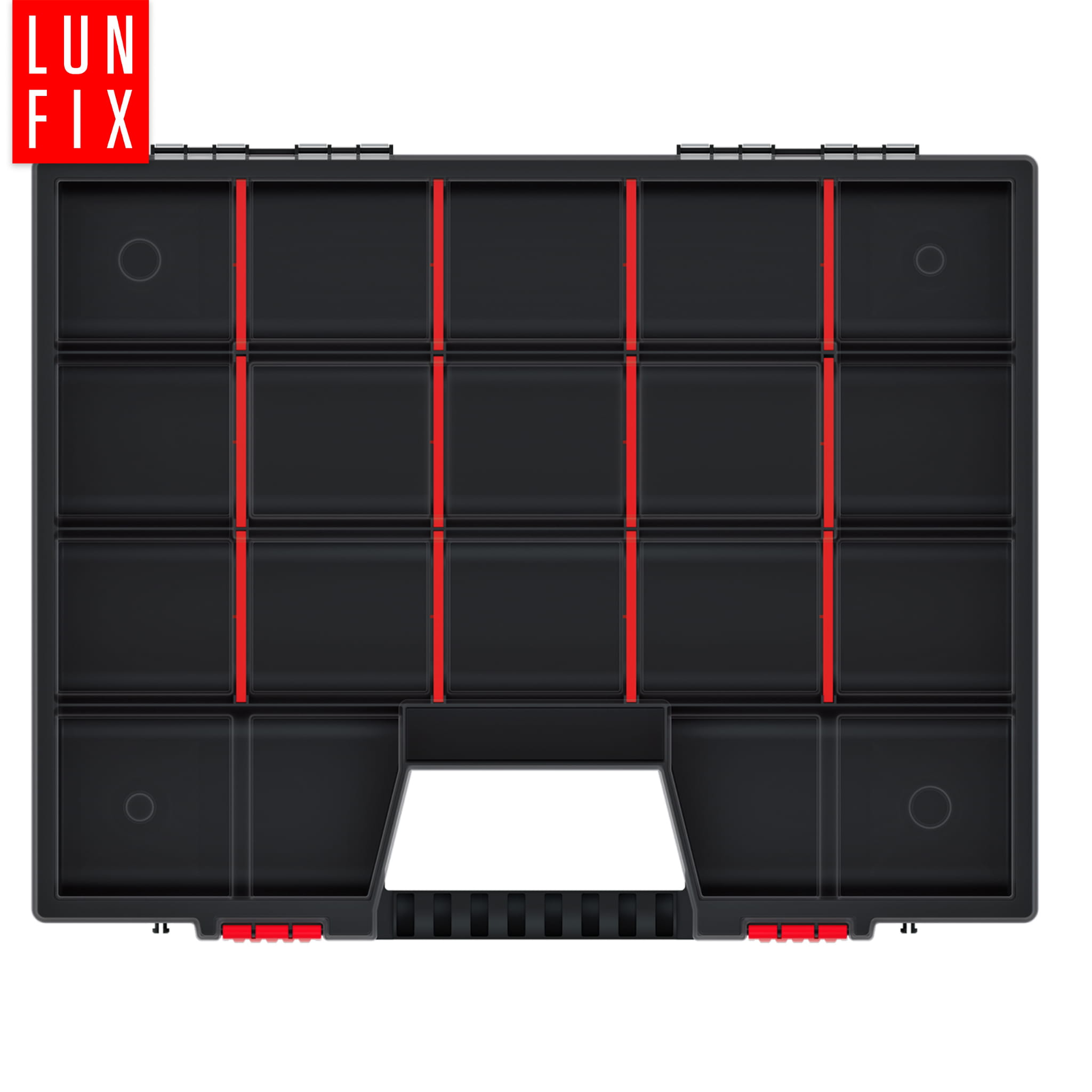 Ergonomická rukojeť umožňuje pohodlné přenášení organizéru a jeho zajišťuje, že těžké prvky v organizéru nezpůsobí zlomení rukojeti