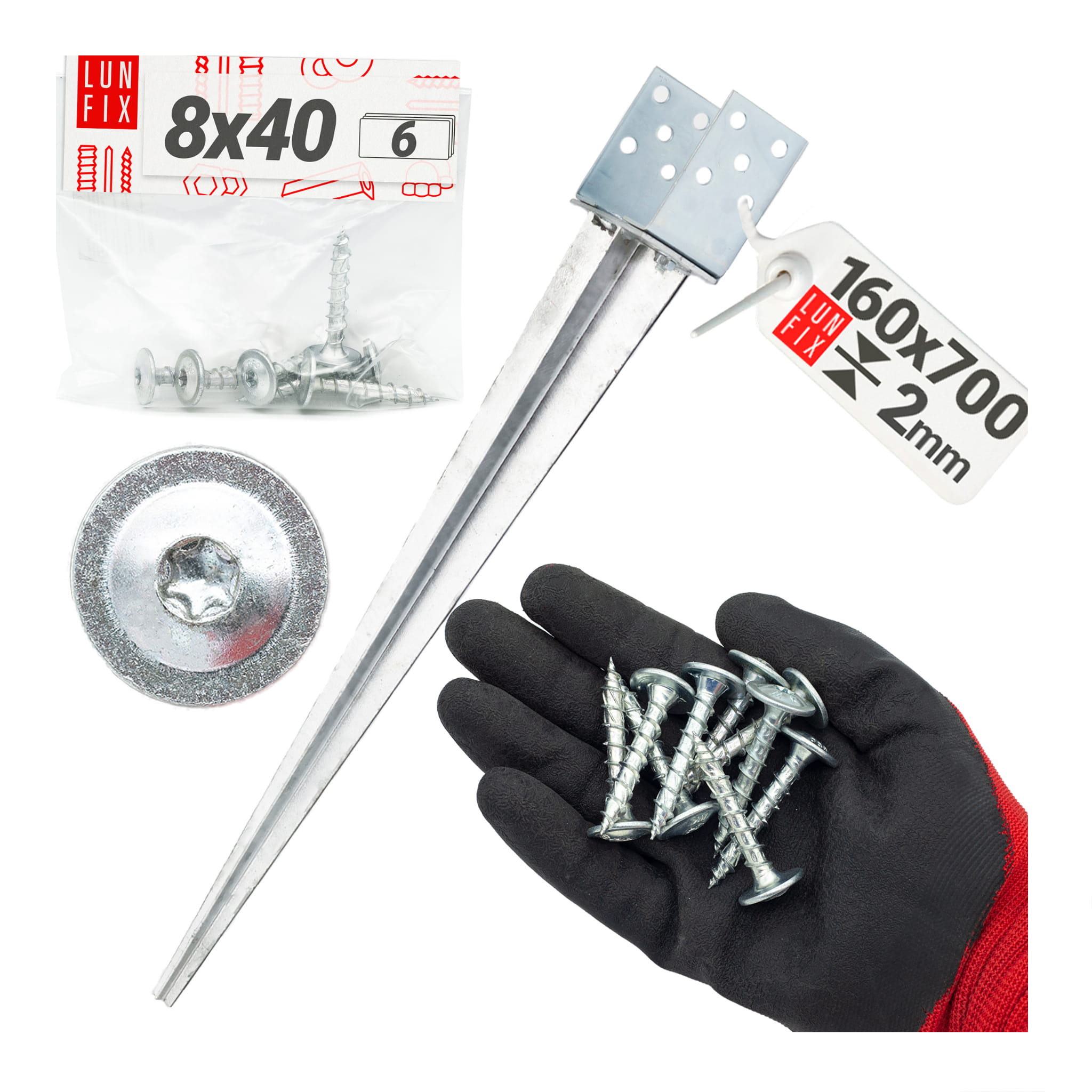 1 podstavec pro sloup a 6 kotoučových šroubů 8 × 40 mm z bílého zinku.