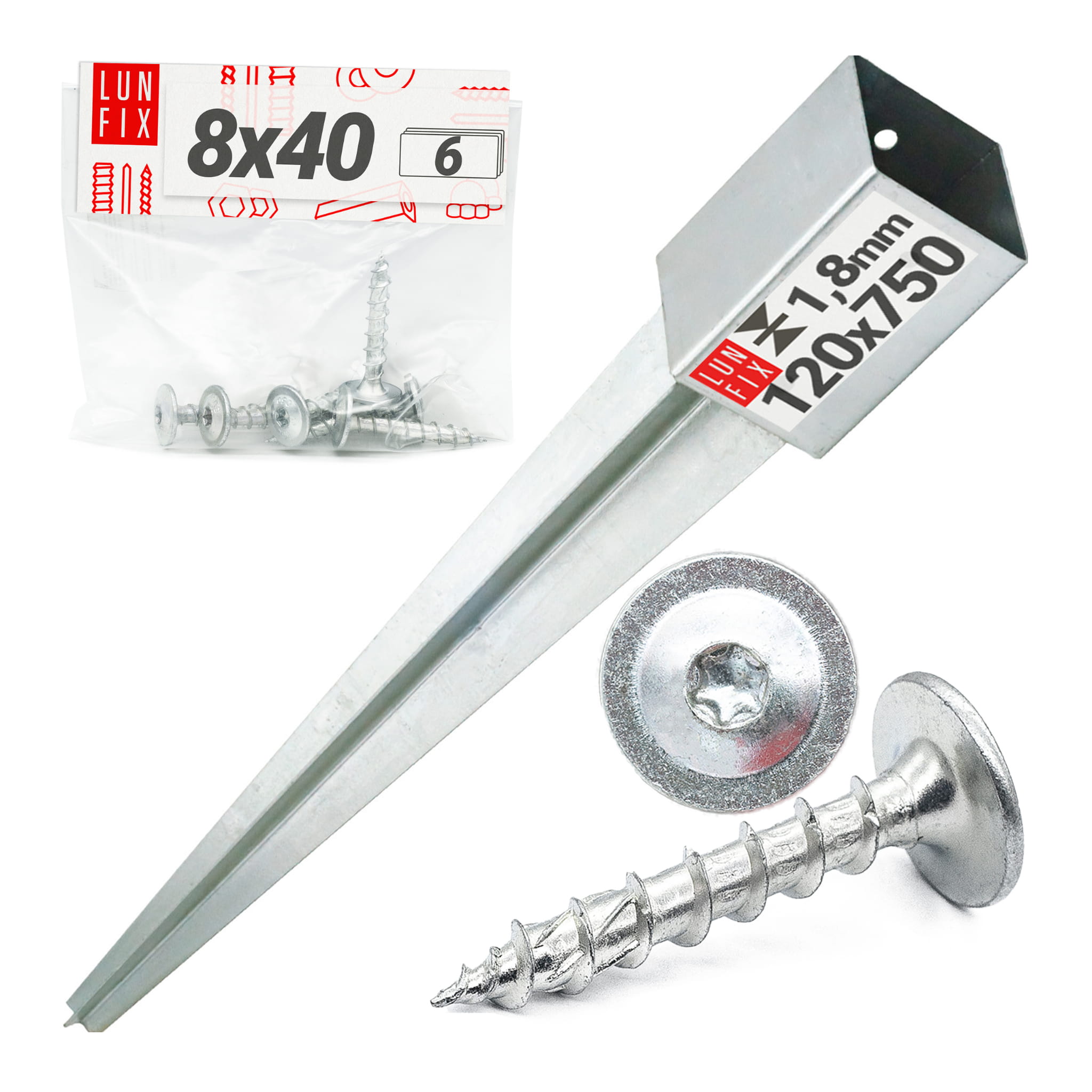 1 ks poháněné tyčové základny 120 × 120 mm a 6 ks kotoučových šroubů 8 × 40 mm z bílého zinku.