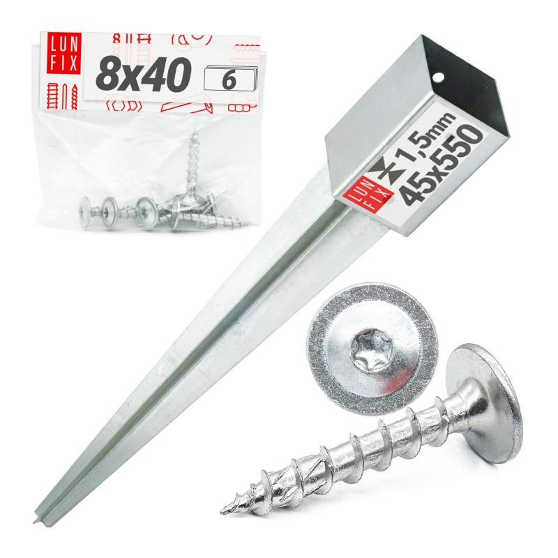 Montážní sada: 45 mm hnaná základna + 8×40 šroubů - rychlá instalace do země. Zkontrolujte podrobnosti: