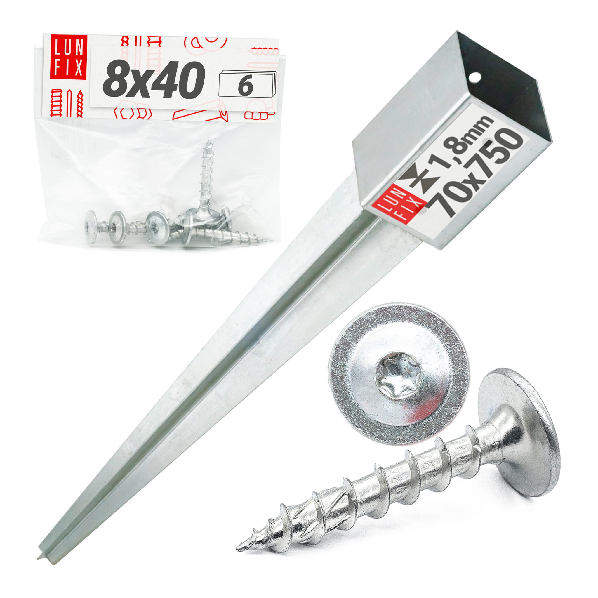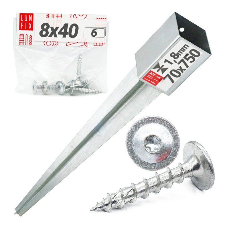 1 ks poháněné tyčové základny 70 × 70 mm a 6 ks kotoučových šroubů 8 × 40 mm z bílého zinku.