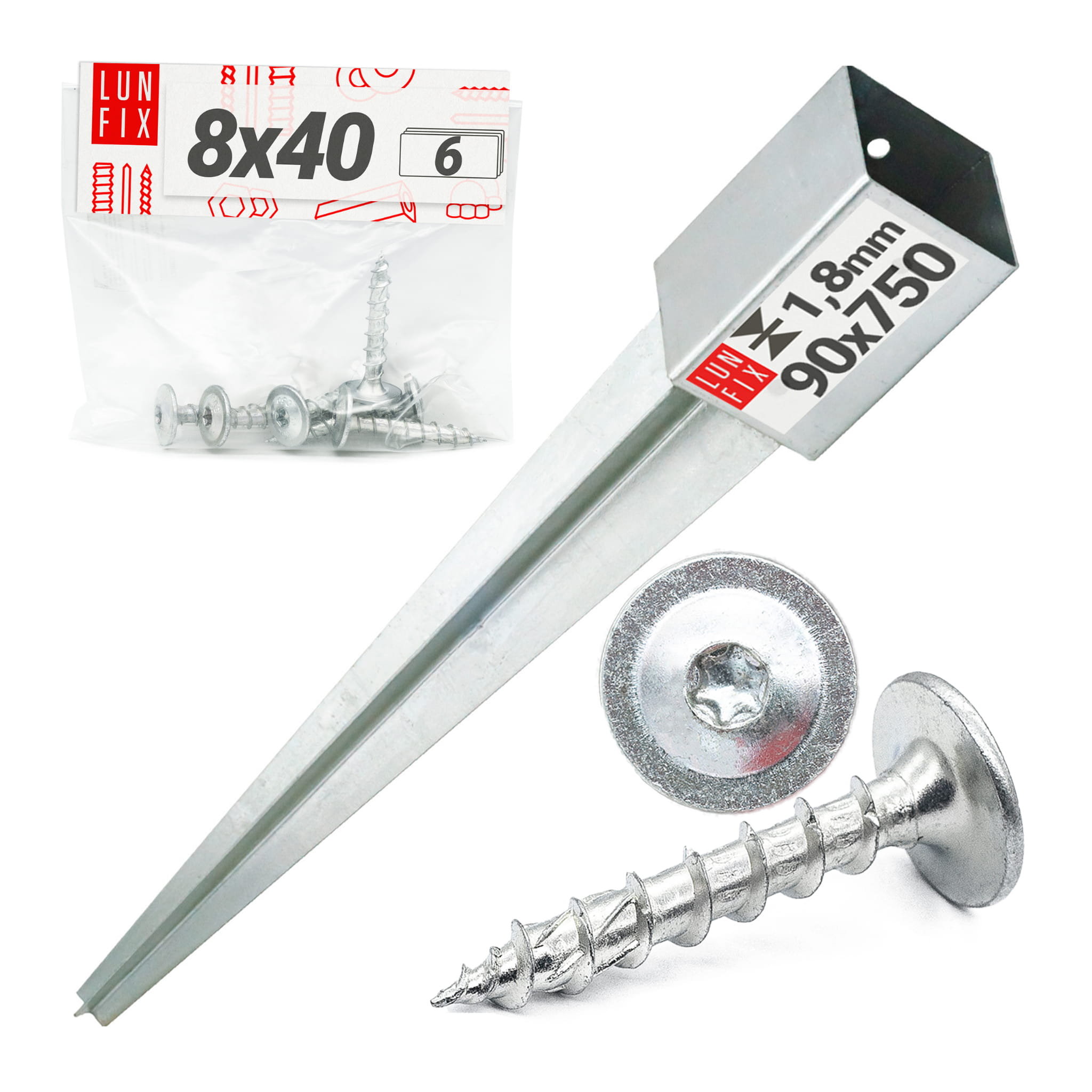 Montážní sada: 90 mm základna + 8×40 šroubů - rychlá instalace do země. Zkontrolujte podrobnosti: