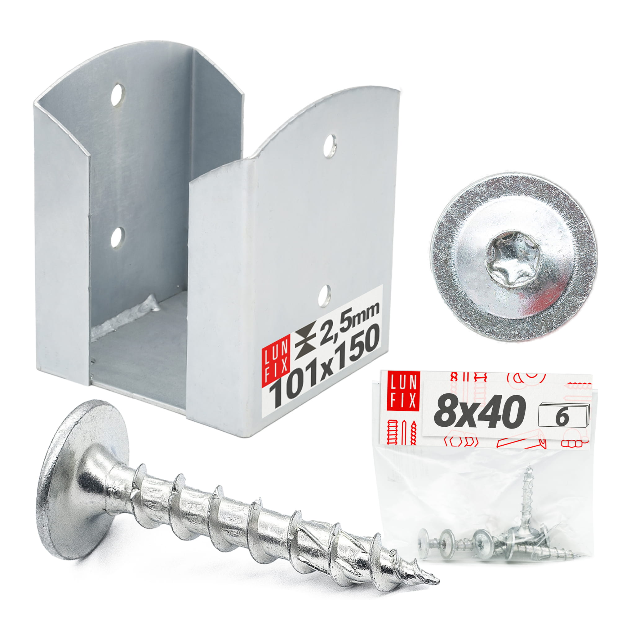 Sada obsahuje jednu šroubovací základnu U-sloupku o rozměrech 10 × 10 cm a šest ocelových šroubů 8 × 40 mm (rovněž pozinkovaných).