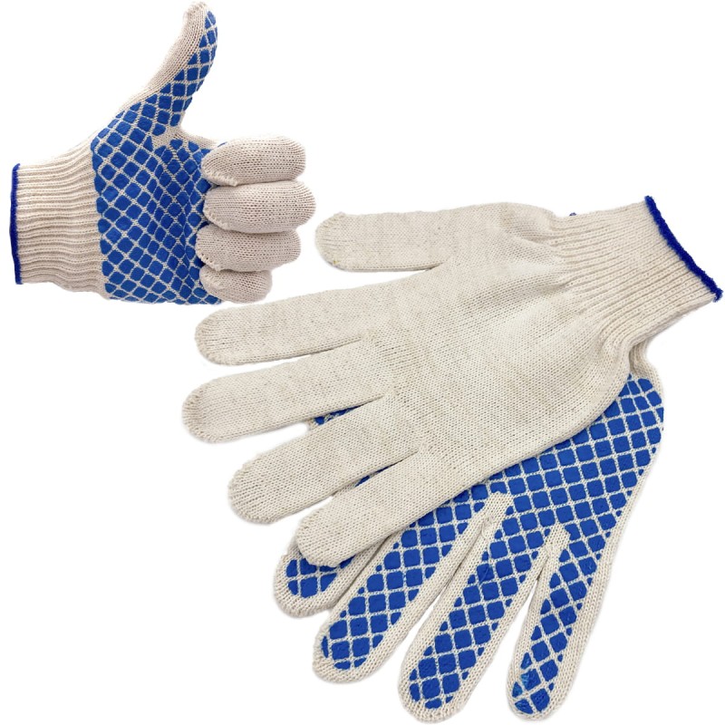 Univerzální rukavice z pletené bavlny, potažené modrým latexem, díky čemuž jsou odolné proti oděru. Rukavice jsou bezešvé, zakončené manžetou a dobře se drží dna rukách. Nelepí se na sebe. Mají anatomický tvar palce.