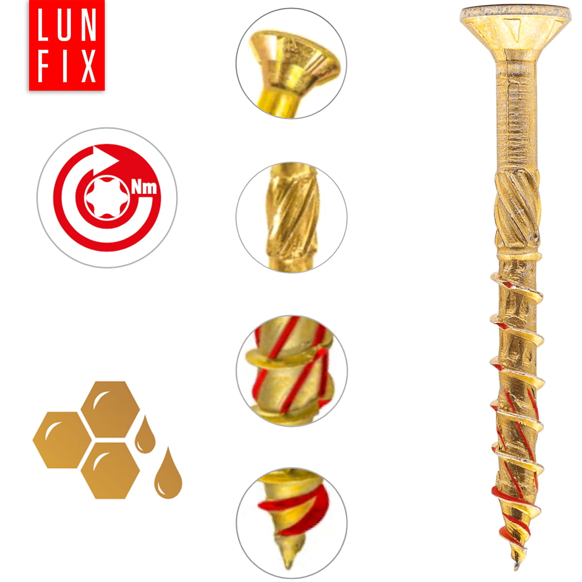 - Kuželová hlava s TORX drážkou – zajišťuje pevné ukotvení ve dřevě a optimální přenos točivého momentu.