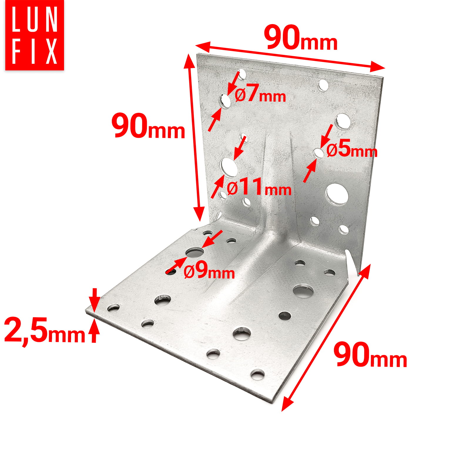Úhelník s hrotem je vyroben z odolné pozinkované oceli o tloušťce 2,5 mm, což zajišťuje dostatečnou odolnost vůči velkým zatížením. Montážní otvory různých průměrů umožňují použití různých šroubů a vrutů, což usnadňuje montáž a přizpůsobení specifickým potřebám konstrukce. Další zpevnění a profilovaný tvar zajišťují lepší odolnost a tuhost. Díky pozinkování je produkt odolný proti korozi, což umožňuje jeho použití v náročných povětrnostních podmínkách.