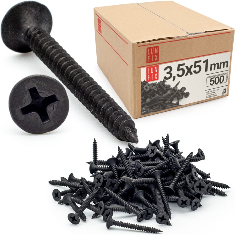 Fosfátované šrouby Lun Fix mají moderní tvar s kuželovou hlavou, která zvyšuje přítlak. Ostré hroty usnadňují průnik skrz hliníkový profil při montáži sádrokartonových stěn. S jejich použitím postavíte pevnou a spolehlivou konstrukci.