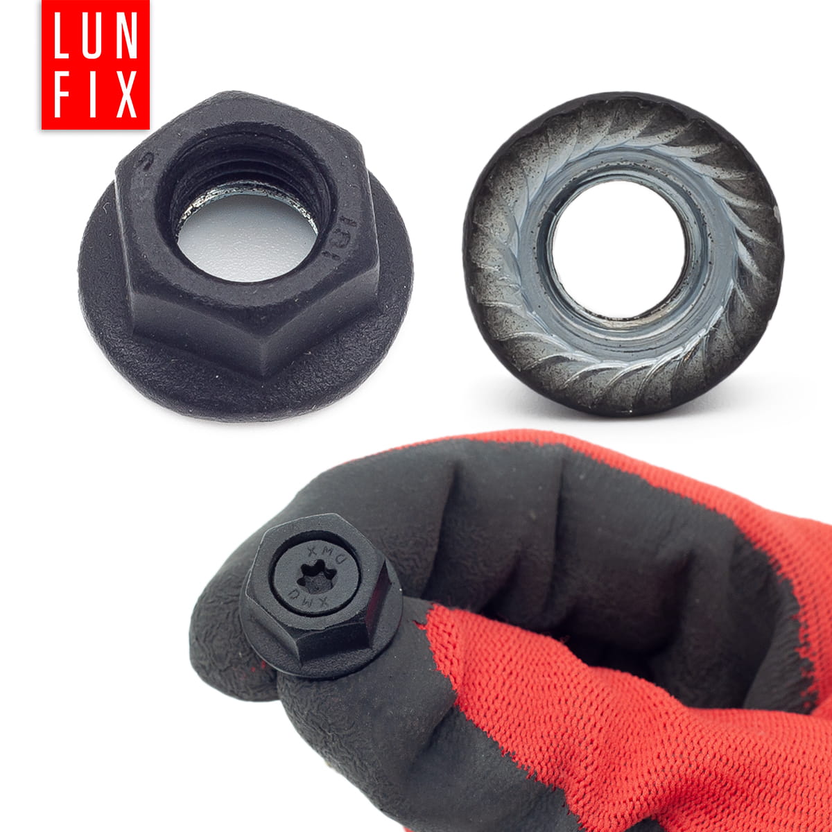 - 12 černěných matic s otvorem a integrovanou podložkou